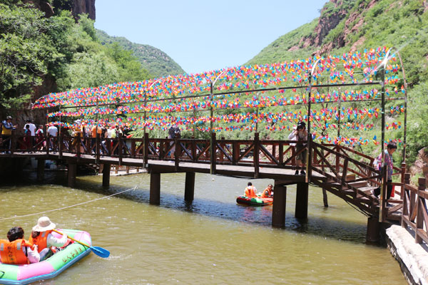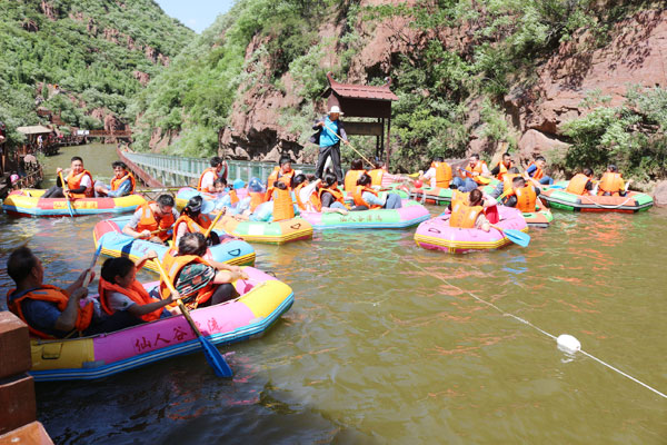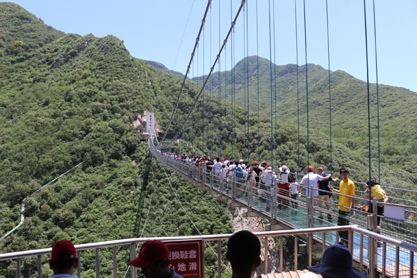經過近2個小時左右的車程終于到達了登封大熊山仙人谷。(大熊山仙人谷景區坐擁高山平湖,谷幽林密,一路飛瀑流泉,其中有攬月湖、仙人洞、情人谷、紅石寨等自然景觀,人文景觀--豫西革命紅色文化展覽館以及中原..長266米玻璃橋--飛云天橋、七彩旱滑、漂流戲水等娛樂項目,素有“十里溪谷、嵩岳勝境”之稱。