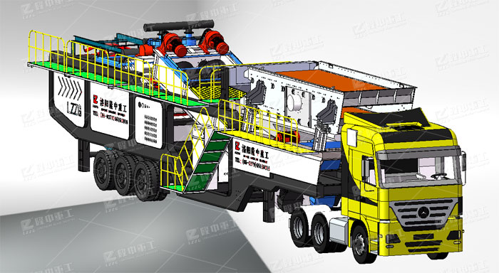 結構組成:移動掛車底盤、篩分裝置、水洗裝置、脫水回收裝置,泵及電機組件,輸送皮帶、電控及液壓系統等。