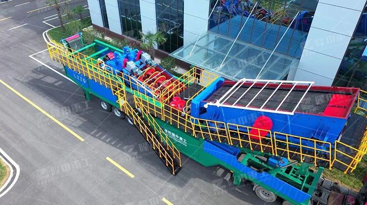 套設(shè)備由移動掛車底盤、篩分裝置、水洗裝置、脫水回收裝置、泵及電機組件,輸送皮帶、電控及液壓系統(tǒng)等組成。