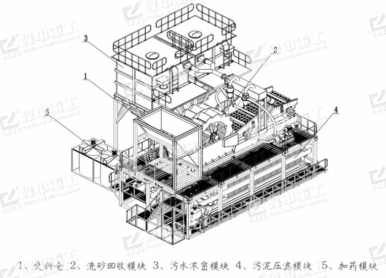 3、一體化設計:集成洗砂、回收、脫水、濃密、壓濾等功能于一體,組合架體設計,模塊化組裝,機型更改空間自由度較高,拆裝靈活性更大。