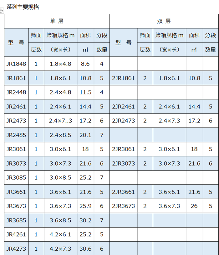 該系列根據(jù)篩機不同用途及處理量大小,采用不同的篩分面積、篩縫尺寸、篩面分段數(shù)量以及篩面傾角,分單層和雙層產(chǎn)品,工作面積5.7m2~30.2m2,共20種主要規(guī)格型號,可基本滿足各種類型礦井和選煤廠生產(chǎn)需要。