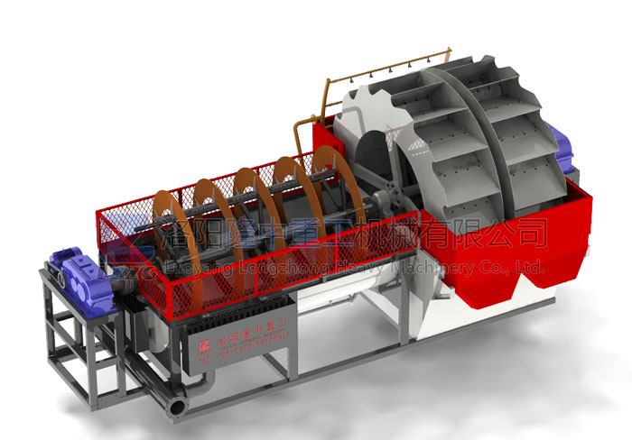 該設備主要分為洗砂部位和細砂回收部位;洗砂部位和一般的輪式洗砂機大致相同,但是在該部位中加入隔板能同時清洗兩種不同粒徑的顆粒,實現洗砂、脫水、脫泥功能。細砂回收部位和傳統的利用旋流器回收細砂有所不同,該設備利用大直徑、低轉速螺旋葉輪將螺旋水槽中沉淀的細砂緩慢的推入輪洗槽內,再由輪斗帶出,經過細砂沉淀后的泥漿水從螺旋尾端溢流出去。與此同時,在螺旋水槽尾部設有可調節的溢流堰板,可通過調節堰板高低來控制細砂回收量。