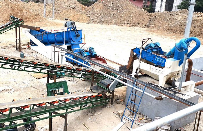 洗沙生產線主要用于山沙、機制沙、河沙、土方沙等泥沙、粉粒含量較高或泥沙粘性較大的沙塵洗滌和回收作業設備的清洗。山沙洗沙線的洗沙工藝流程一般包括“一篩二洗”,即通過洗沙工序清洗、收集顆粒大小相近的沙子,經過細沙回收機,將有利用價值的特細沙過濾收集,泥粉、石粉等含量較高且不利于提高砂石質量的成分隨廢水排出,可得到使用價值較高的中細沙、特細沙等(具體得到的產品規格可根據工藝要求調整)。