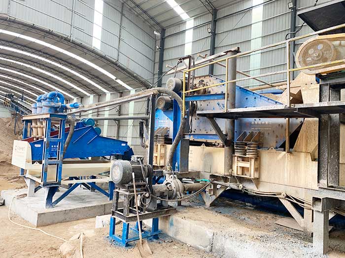 2、而洗砂機(jī)溢流的洗砂廢水則進(jìn)入到該設(shè)備清洗箱中,經(jīng)由底部真空高壓泵抽至旋流器中進(jìn)行分級(jí)濃縮,通過(guò)高速離心力和額定的入料壓力,旋流器將洗砂廢水中的細(xì)沙與水分離,而后將濃度被提升至60-70%的細(xì)沙通過(guò)沉沙嘴排入振動(dòng)脫水篩表面,在高頻振動(dòng)電機(jī)的帶動(dòng)下,實(shí)現(xiàn)細(xì)沙的脫水回收,而其他的廢水、泥、粉等雜質(zhì)則通過(guò)旋流器溢流口進(jìn)入返水箱排出。