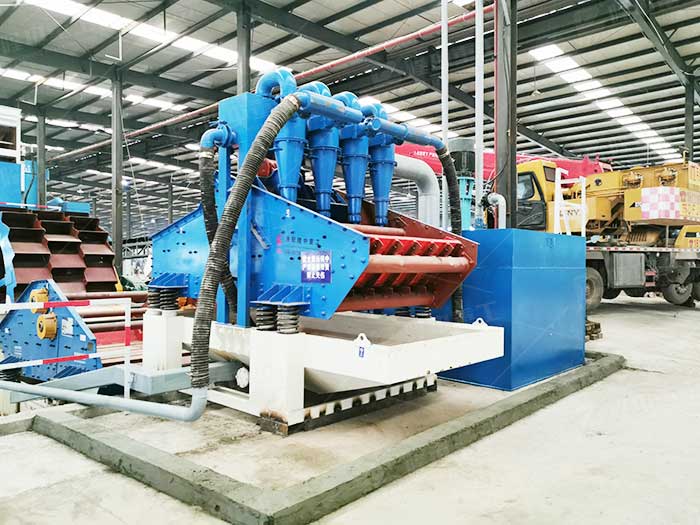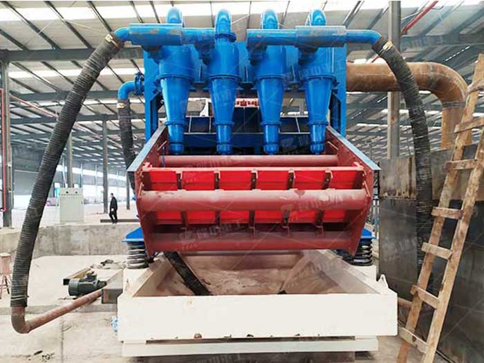 工作時,泥漿水流入到細砂回收機的清洗槽,然后槽內的耐磨泵吸入泥漿水并將其送至高壓分離器,高壓分離器的作用是將砂料和污水分離,經過分離的砂料從噴頭噴至脫水篩進行脫水作業之后被送到輸送帶,而剩下的污水則回流到返料箱,分流再次進入清洗槽,多余的部分外排出去。